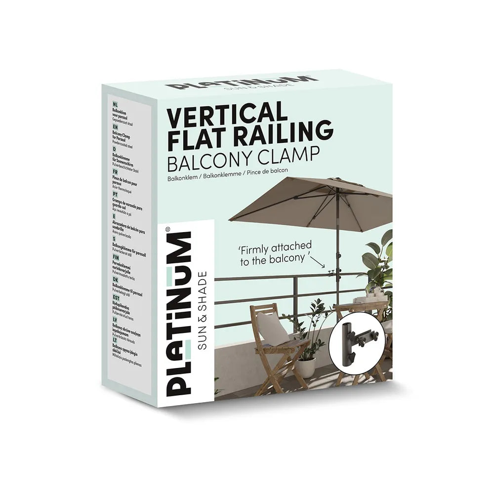 Platinum Sun & Shade balkonklem. Ideale oplossing voor het moeiteloos creëren van schaduw op het balkon. Geschikt voor verticale platte relings. Niets staat in de weg om te kunnen genieten van het mooie weer.
