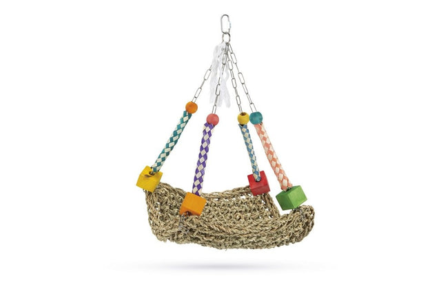 Op zoek naar een leuk en vrolijk hangspeeltje voor in de vogelkooi? Dan is het Beeztees Nykie vogelspeeltje iets voor jouw vogel. Dit speeltje, gemaakt van geweven gras, kun je eenvoudig ophangen door middel van het metalen haakje. Jouw vogel kan op de mat zitten en spelen met het leuke flosje en de houten blokjes en kralen.