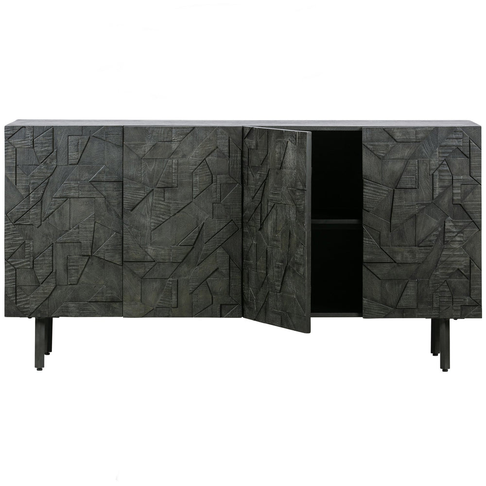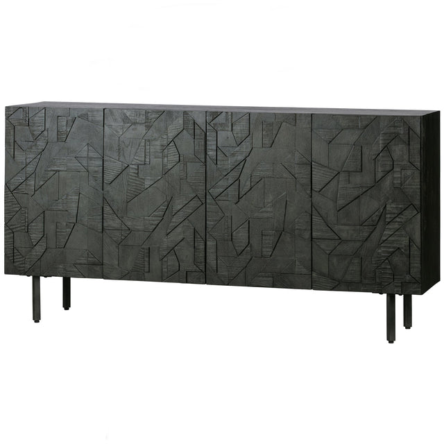 Het dressoir heeft een totale hoogte van 83 cm, is 160 cm breed en 40 cm diep. De metalen poten hebben een hoogte van 18 cm. Het metalen frame is 2x2 cm dik. De vier deuren met houtsnijwerk zijn 65 cm hoog, 39,5 cm breed en 2 cm dik. De deurtjes beschikken over een softclose systeem. De inhoud van de kast is in twee grote vakken verdeeld met elk een 78 cm brede legplank. Deze legplank heeft een diepte van 33,5 cm, aan de achterzijde is een kier van 1,5 cm dus kleine items kunnen op de onderste plank belanden. De open vakken hebben in een inhoud van (hxbxd) 30x78x35 cm.