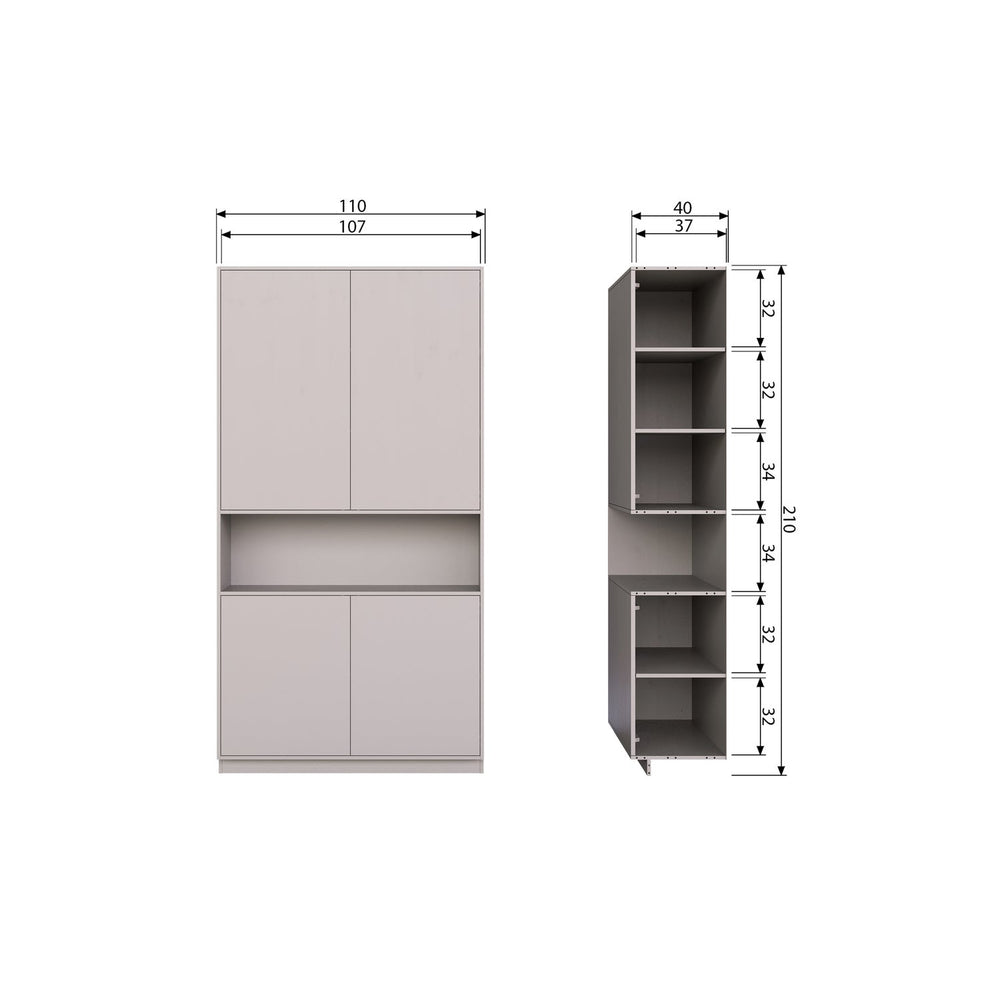 De Finca buffet-/opbergkast 110 cm is de brede variant, de smalle buffetkast is een 1-deurs van 40 cm breed. De bovenste twee deuren van de Finca buffetkast dekken drie handige opbergvakken af. Hieronder bevindt zich een open vak voor het presenteren van jouw mooiste woondecoratie. De twee onderste deuren houden nog eens twee ruime opbergruimten uit het zicht. De twee bovenste - en twee onderste vakken hebben elk een hoogte van 32 cm, een breedte van 108 cm en een diepte van 37 cm. De twee vakken in het midden hebben een hoogte van 34 cm. De onderrand van de buffetkast laat 7 cm ruimte over aan de voorzijde, hierdoor lijkt het meubel te zweven.