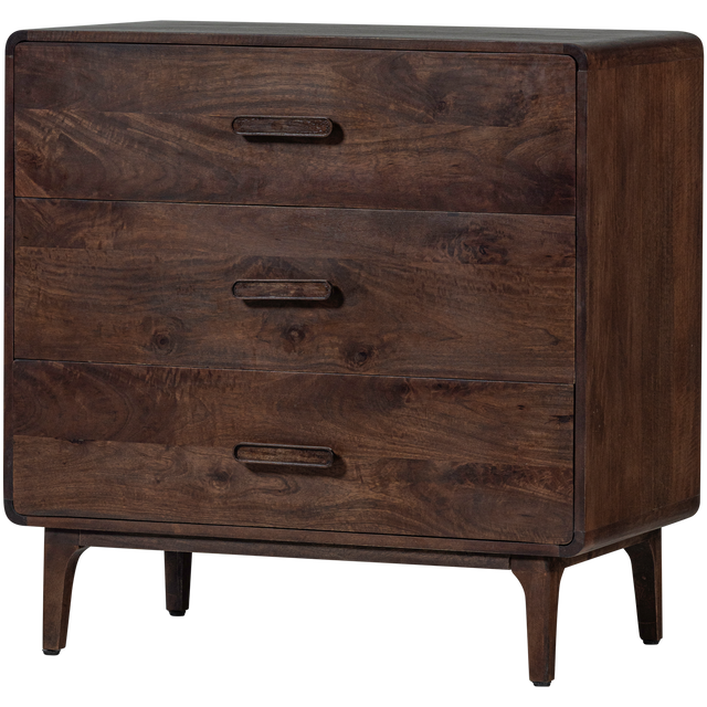 Liya is een elegante ladekast uit de collectie van het Nederlandse merk WOOOD. De kast beschikt over drie ruime lades, elk voorzien van een speelse maar verfijnde handgreep. Dankzij de royale opbergruimte houd je jouw spullen eenvoudig uit het zicht en creeer je rust in je interieur. De ladekast is vervaardigd uit hoogwaardig mangohout en afgewerkt in een diepe, donkerbruine kleur. Het natuurlijke houtpatroon geeft Liya een warme, luxe uitstraling, waardoor dit meubelstuk een echte eyecatcher is in iedere woonruimte.