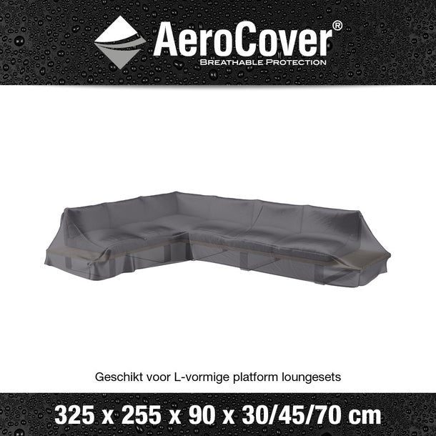 Loungesethoes van AeroCover. Ademende loungesethoes voor loungesets met platform links 325x255x90xH30/45/70. AeroCovers zijn ademend, waterbestendig, reduceren condensvorming en gaan schimmelvorming tegen. Wanneer u in de set zit is de linkerzijde langer dan de rechterzijde. De stof heeft een hoge kleurechtheid dankzij de door en door geverfde vezels. Een AeroCover hoes verlengt de levensduur van uw tuinmeubelen. AeroCovers zijn vervaardigd van sterk en lichtgewicht ripstop polyester. Ze zijn makkelijk hanteerbaar en nemen weinig ruimte in wanneer niet in gebruik. De afdekhoes is voorzien van rijgkoord met 2 stoppers voor een goede pasvorm. Inclusief handige opbergtas. AeroCover stoffen zijn 100% waterdicht, de naden zijn, net als elke ander hoes, spatwaterdicht.