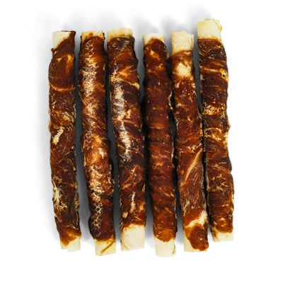 • Gemaakt van runderhuid, omwikkeld met eendenvlees