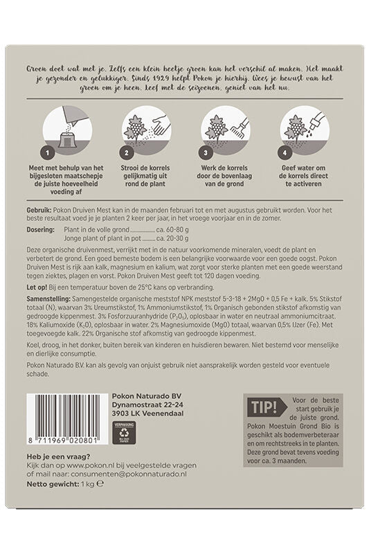 Pokon Druiven Mest, verrijkt met in de natuur voorkomende mineralen, voedt de plant en verbetert de grond. Dit zorgt voor gezonde planten. Gezonde planten hebben meer weerstand tegen ziektes en plagen en geven heerlijk fruit.