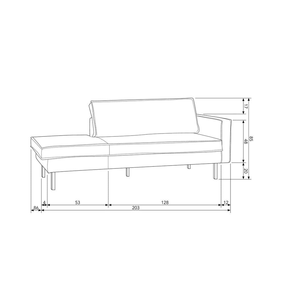 Het Rodeo daybed heeft een totale hoogte van 85 cm, breedte van 203 cm en diepte van 86 cm. De zithoogte is 45 cm en een zitdiepte van 60 cm zorgt voor een fijn ondersteunende zit. De zitbreedte van het daybed bedraagt 194 cm en heeft een los zit- en rugkussens. De armleuning heeft een breedte van 12 cm en een hoogte van 68 cm, gemeten vanaf de vloer. De metalen poten zijn 20 cm hoog. De bank kan 200 kg dragen, wanneer gelijkmatig verdeeld.