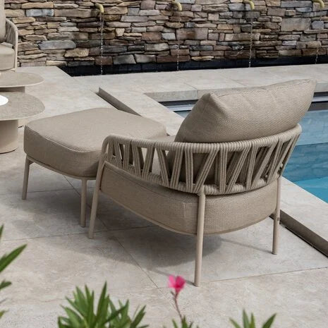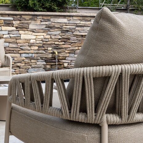 De rug- en armleuningen zijn met de hand afgewerkt met een prachtig geweven patroon van taupe rope. Dit robuuste touw is vervaardigd uit hoogwaardig synthetisch materiaal dat bestand is tegen zonlicht, regen en temperatuurverschillen. De karakteristieke rope-structuur zorgt voor een luchtige uitstraling en een stijlvolle, eigentijdse look die kenmerkend is voor de Calma-serie.