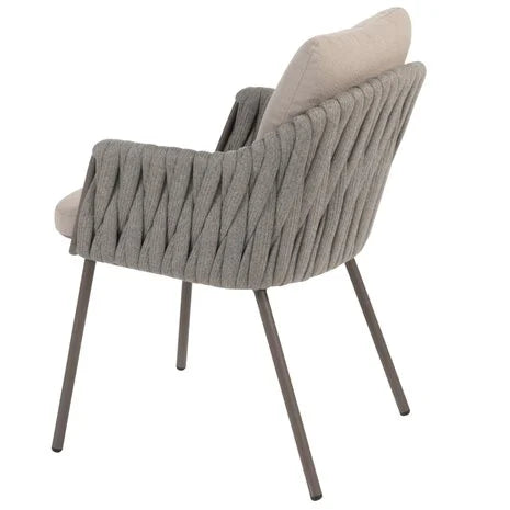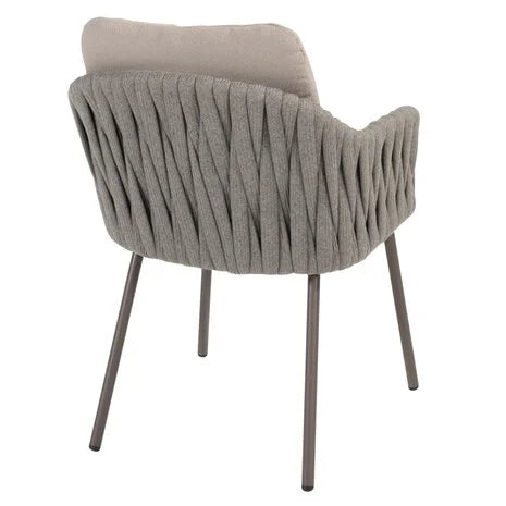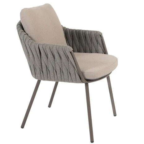 De Cannes dining stoel heeft een verfijnd en eigentijds ontwerp dat moeiteloos aansluit bij uiteenlopende tuin- en terrasstijlen. Het frame is gemaakt van gepoedercoat aluminium in de kleur terre, een warme en moderne tint die rust en elegantie uitstraalt. Rondom de rugleuning en armleuningen is de stoel afgewerkt met een prachtig gevlochten rope in een stijlvolle grijze kleur. Deze combinatie van kleuren en materialen geeft de Cannes stoel een uitnodigende, natuurlijke uitstraling die perfect past in elke buitenomgeving.