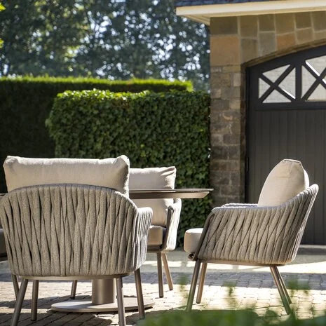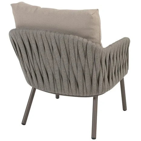 De Cannes low dining stoel onderscheidt zich door zijn verfijnde vormgeving en harmonieuze materiaalcombinatie. Het stevige frame is gemaakt van gepoedercoat aluminium in de kleur terre, een elegante taupe-tint die warmte en rust uitstraalt. Rondom de rugleuning en armleuningen is de stoel met de hand afgewerkt met een brede, luxe rope in grijs, wat zorgt voor een verfijnd, ambachtelijk karakter.