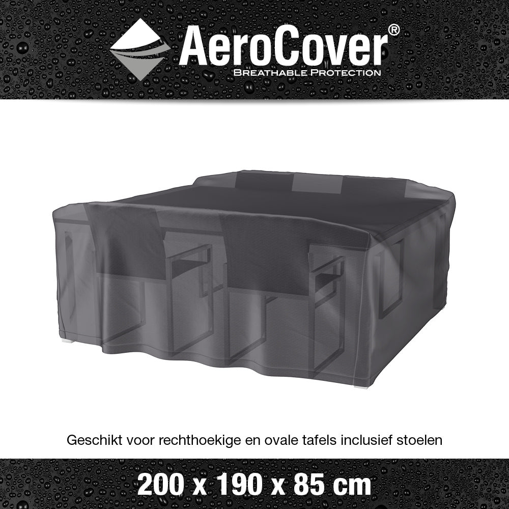 Tuinmeubelhoes voor tuinset van AeroCover 200x190cm. Ademende tuinsethoes o.a. geschikt voor rechthoekige tafels van 180cm tot 200cm met stoelen. AeroCovers zijn ademend, waterbestendig, reduceren condensvorming en gaan schimmelvorming tegen. De stof heeft een hoge kleurechtheid dankzij de door en door geverfde vezels. Een AeroCover hoes verlengt de levensduur van uw tuinmeubelen. AeroCovers zijn vervaardigd van sterk en lichtgewicht ripstop polyester. Ze zijn makkelijk hanteerbaar en nemen weinig ruimte in wanneer niet in gebruik. De afdekhoes is voorzien van rijgkoord met 2 stoppers voor een goede pasvorm. Inclusief handige opbergtas. AeroCover stoffen zijn 100% waterdicht, de naden zijn, net als elke ander hoes, spatwaterdicht.